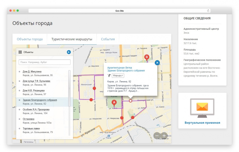 Сервис «Интерактивная карта объектов» обеспечивает возможность демонстрации различных объектов города: государственных, медицинских и образовательных учреждений, театров, музеев и спортивных комплексов. Также содержит подробную информацию об этих объектах и туристические маршруты.