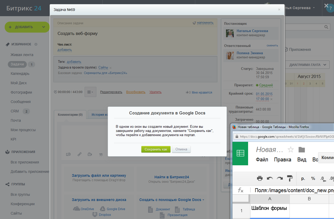 Система управления документами дает возможность вести историю изменений документа, загружать сразу несколько файлов, подключить портал как сетевой диск для всех операционных систем (всех версий Windows, Mac OS, Linux). У каждого документа есть единая карточка, работает быстрый поиск по файлам и по содержимому (с мгновенным поиском и подсказками), удаленные документы остаются в «Корзине». При работе с документами можно использовать бизнес-процессы. Реализована поддержка версионности. Также вы можете, работая как в Windows, так и в Mac OS, с помощью «Битрикс24.Диск» получить доступ к вашим документам на портале с любого устройства и синхронизировать все изменения между этими устройствами. Благодаря поддержке технологий Google Docs вы можете открыть, просмотреть и отредактировать непосредственно на портале любые файлы популярных форматов.