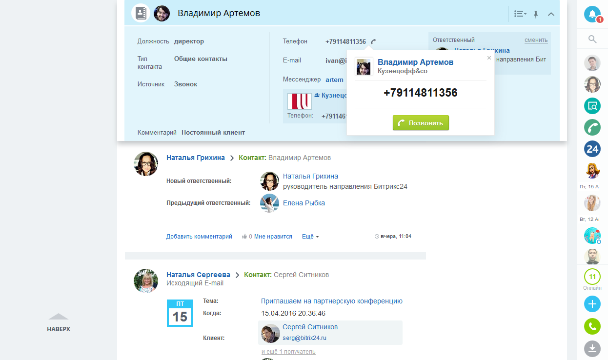 CRM-система (Customer Relationship Management) служит для учета потенциальных и текущих клиентов, журналистов, партнеров и других «лидов». Полученные разными способами «Лиды» загружаются в CRM-систему, после чего распределяются между сотрудниками, которые связываются с потенциальными клиентами и отмечают результат на портале. В отчете CRM-системы строится воронка продаж с настройкой неограниченного числа уровней. CRM-систему можно интегрировать с сайтом компании, чтобы сохранять полученные лиды (например, заполненные веб-формы) напрямую в CRM на корпоративном портале. Вы можете выставлять счета в CRM и следить за статусами их оплаты. Вы можете с любого мобильного устройства оперативно получать информацию из CRM - мобильно следить за содержимым CRM: за каталогом товаров, клиентской базой, своими делами и сделками.